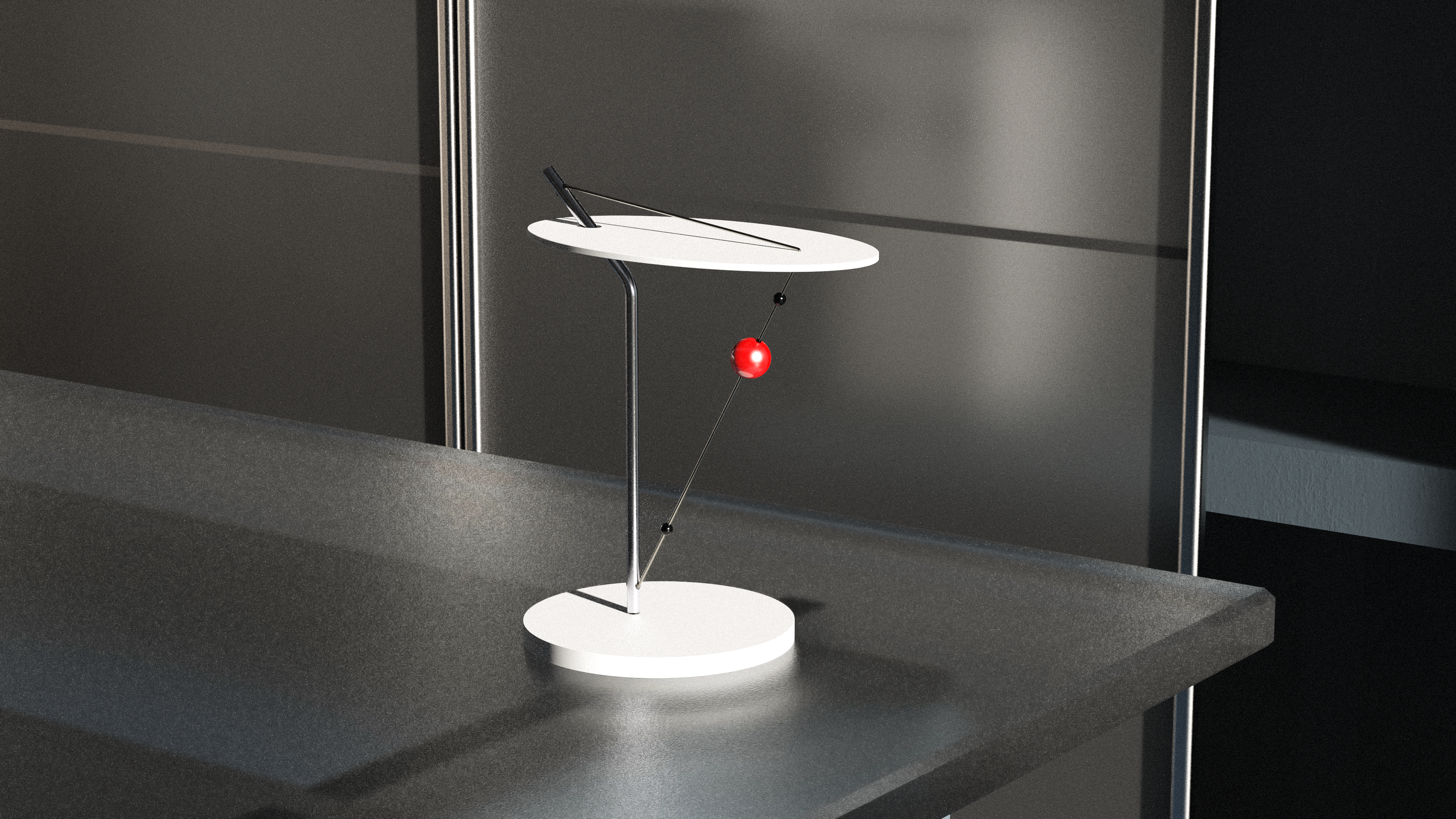 In this table lamp, the plane and line consist triangle. We can see the characteristic of light called limitation. When the red sphere is moving up and down in diagonal line, we can imagine the instant movement of shooting star. The red sphere means shooting star. So if the shooting star no longer appears to be light as it moves away from our view, it would be interpreted that the red sphere is going down.